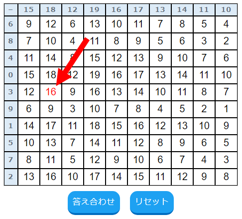 たとえば下図のように、上が「18」で左が「8」なら「18-8=10」で『10』を入力、左が上が「17」で左が「3」のマスは「17-3=14」となるので『14』です。