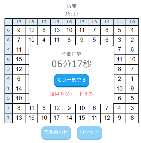 すべて正解したらこのように正解した時間が表示され、この記録をツイートすることもできます。