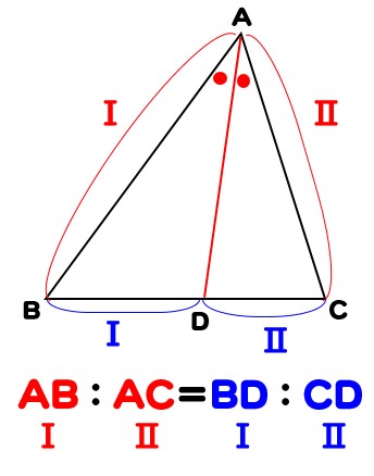 下図のように三角形ABCにおいて、∠Aの二等分線を引き、辺BCと交わる点をDとすると以下のような比が成り立ちます。