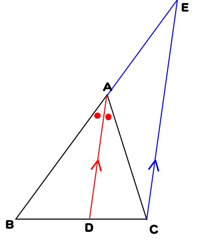 下図のように、三角形ABCにおいて、辺BAの延長線と辺ADと平行な線を点Cから引いた線の交点をEとする。