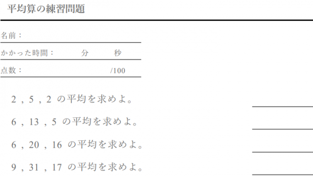 小学5年生で習う平均算の問題集です。基本的な計算の問題数問と文章問題を用意しました。