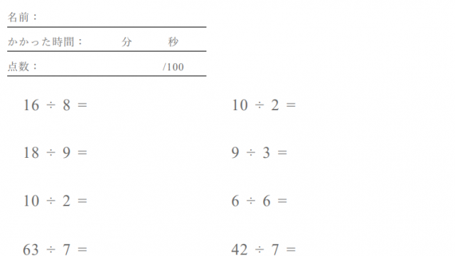 あまりがでない割り算の問題集です。割る数・商がともに1桁なので、九九でできる計算の逆算になります。