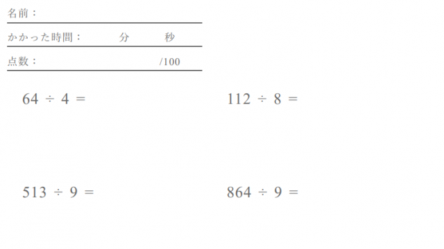 あまりが出ない割り算の問題集です。割る数は1桁ですが商が2桁になるので筆算で解くのが基本。