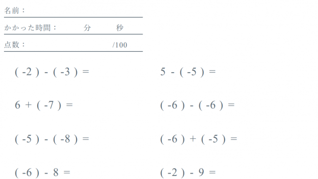 計算ドリル/問題集【中学校数学】「正負の数」の足し算・引き算【計算ドリル/問題集】 12月 7, 2018 管理人 数学FUN 中学校1年の数学で習う「正負の数の足し算・引き算」の問題集です。 問題の数値はランダムで生成することができ、答えの表示・非表示も切り替 …