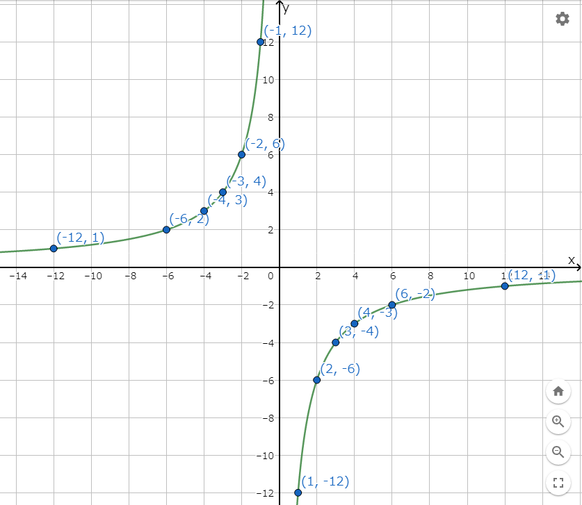 グラフ上のどの座標も\(x\)座標と\(y\)座標の積が\(-12\)になります。