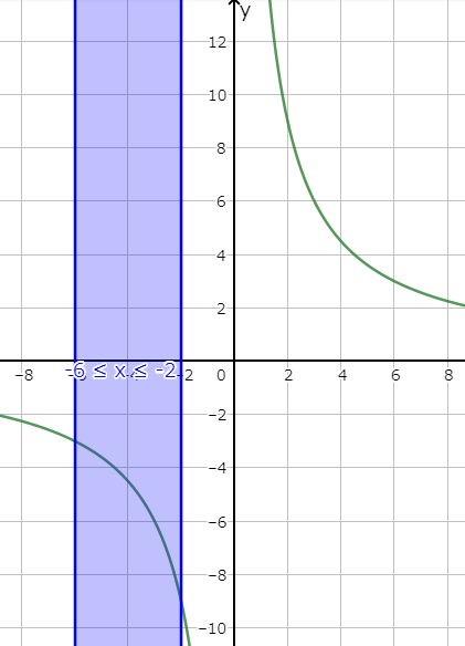 この反比例の式の比例定数は不明ですが、\(x\)の変域が負のときの\(y\)の変域も負なので比例定数は正となるのが分かるかと思います。なので下のようなグラフになります。