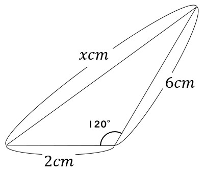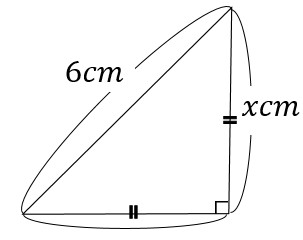 大きな直角三角形に注目すると、斜辺が\(xcm\)、底辺\(5cm\)、高さ\(3\sqrt{3}cm\)なので、
