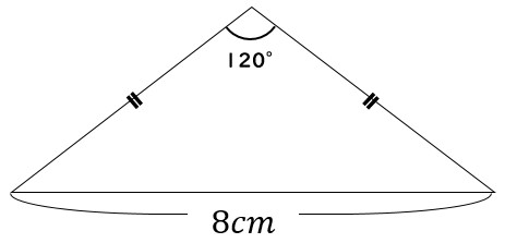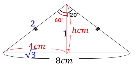 二等辺三角形に図のように垂線を入れると、30°、60°、90°の\(1:2:\sqrt{3}\)の直角三角形ができます。
