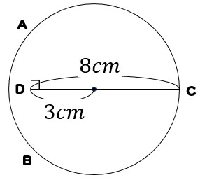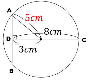 図のように円の中心からAに向けて補助線を引くと、斜辺が\(5cm\)、底辺\(3cm\)の直角三角形ができます。