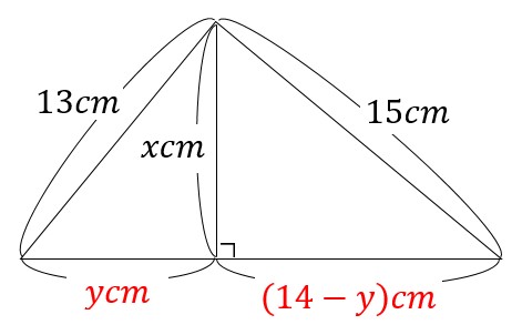 下図のように、片方の直角三角形の一辺を\(ycm\)とおくと、もう一方は\((14-y)cm\)です。