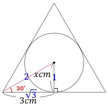 これは\(1:2:\sqrt{3}\)の正三角形で、比の「1」にあたるの\(xcm\)、「\(\sqrt{3}\)」にあたるのが\(3cm\)なので、