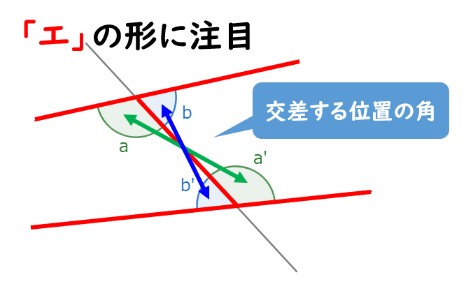 内側の4つの角の交差する位置の角が錯角と覚えましょう。「エ」の形に注目するとわかりやすいです。